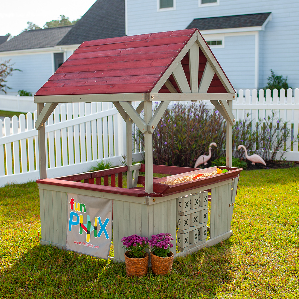 Offering a host of exciting features, this backyard playhouse puts the fun into multifunctional! It’s a great way to get your kids off the couch and out in the fresh air. It gives youngsters an interesting and safe space to roleplay with their friends, while learning valuable socialization and teamwork skills. Your kids will have their own secret clubhouse, complete with a roof to provide shade, a bench where they can hang out, and doors they can scramble through. Creative kids will love to dig in the sandbox and challenge their friends to a game of supersized tic tac toe! The sturdy cedar wood parts ensure safe playtimes, while assembly is easy with no complex instructions. With its rustic design, the Hangout Hut will charm you and your kids. Order this Funphix playhouse to give your kids the gifts of social play and messy fun!