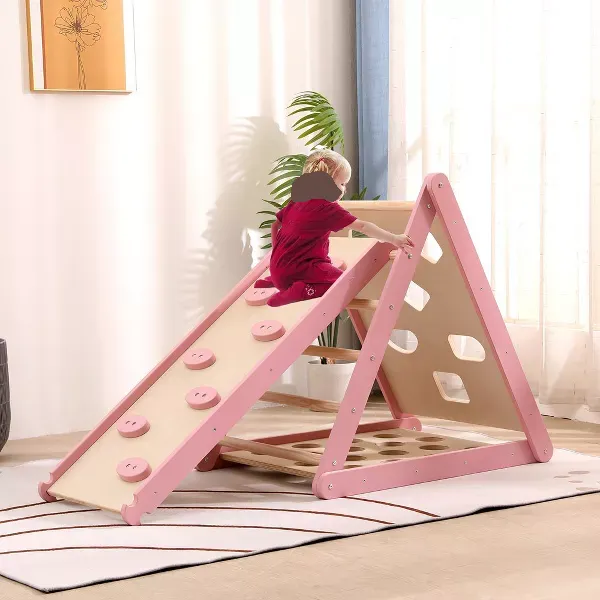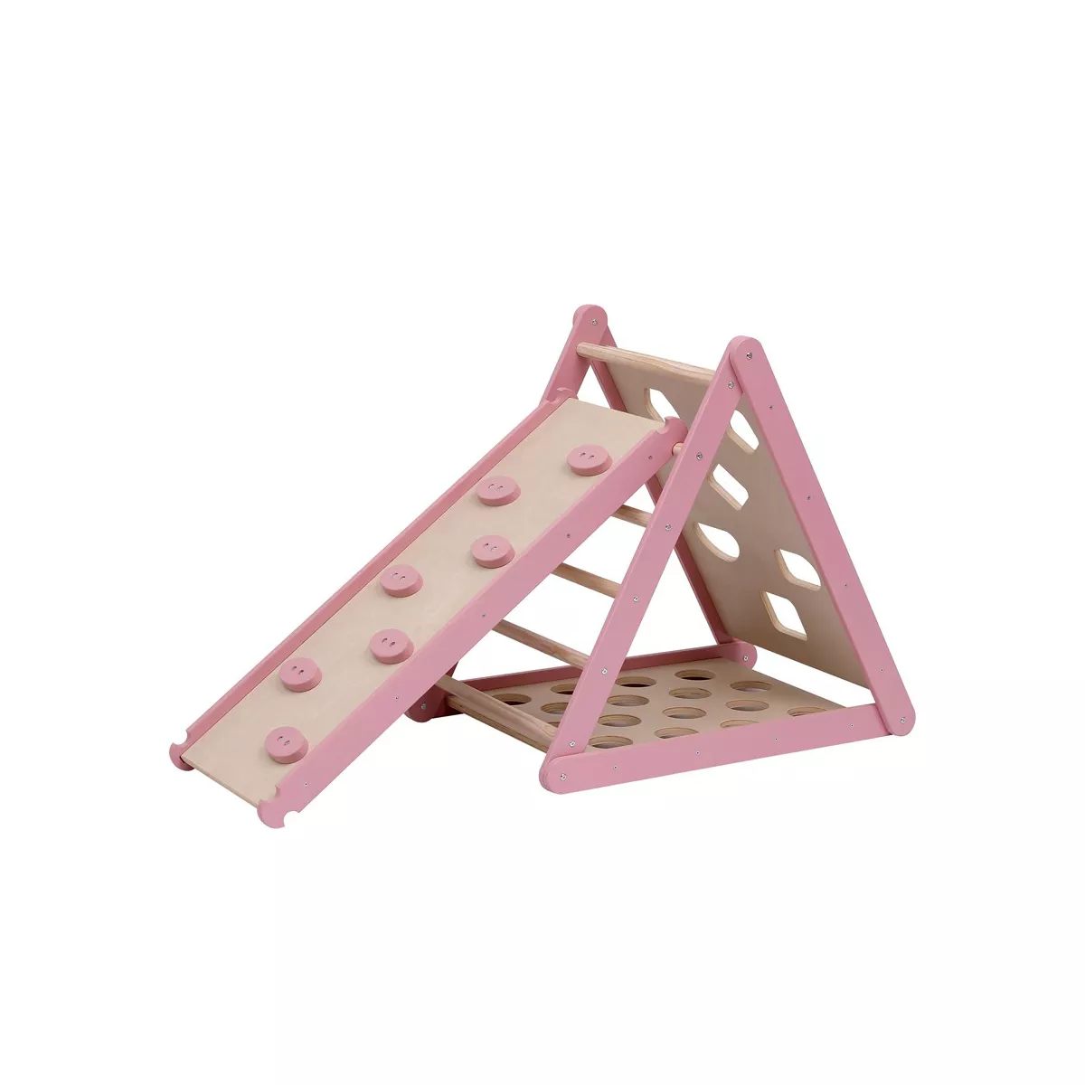 Maximize your toddler's potential with the Toddler Indoor Climbing Wall with Blue Grips, a thoughtfully designed climbing gym that blends fun, safety, and aesthetics. Expertly crafted from sturdy natural plywood and adorned with charming pink accents, this play gym invites toddlers to climb, slide, and explore in the safety of their own home. Ideal for children aged 1 to 4, it's perfectly sized for indoor spaces, from kitchens to bedrooms. Whether as a present or a delightful addition to your child's play area, this climbing toy promises hours of active play and