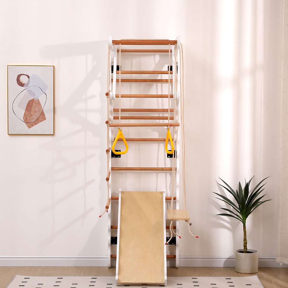 - Indoor playset with gymnastic rings, a rope ladder, a wooden swing, a wall ladder, and a pull-up bar