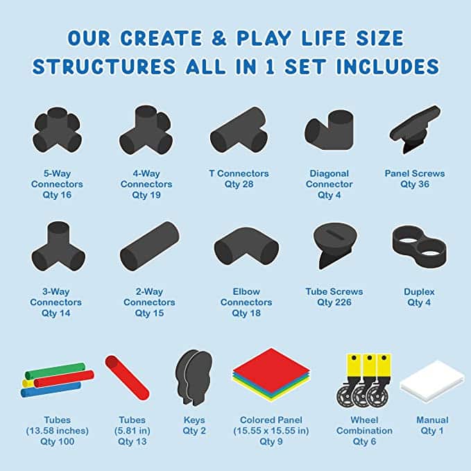 • “BUILD LOTS OF LIFE SIZE STRUCTURES – The All in 1 set includes the special duplex connector that lets your kids build ramps and slides in addition to forts, playhouses, jungle gyms, and vehicles. Combine the easy-assemble parts with other Funphix building sets for even bigger structures and limitless creativity!”