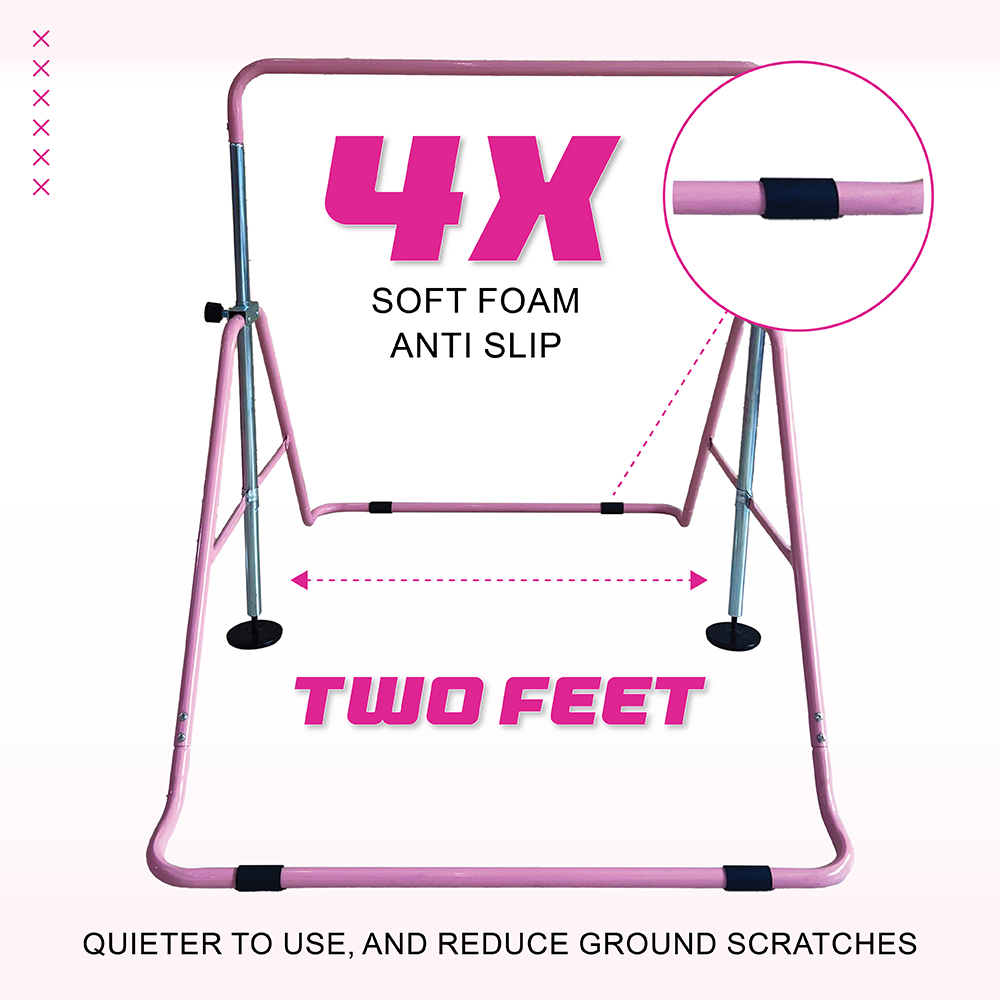 Create the gymnastics home gym that’ll take your little gymnast from tumbling as a toddler to perfecting her glide kip. The 5-level adjustable bar challenges her as she grows, while the double-locked screws keep her safe. With soft, anti-slip foam at each floor contact, this gymnastics bar stays firmly in place without damaging your flooring. Simply fold it for out-of-the-way storage and use it as a hanging rack for her competition leotards.