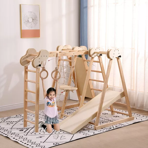 Transform your home into a captivating adventure land with our Wood Jungle Gym for Kids Age 1-7. This 8-in-1 indoor playground, standing at a safe height of 4 feet, is specifically designed for toddlers and young children, providing endless hours of fun and physical activity. It includes an array of playful features: a pine wood ladder, an imaginative cloud seat swing, a smooth slide, two ring swings, a rope ladder, swinging ladder, top bars, and brightly colored stepping stones. Each element is crafted from high-quality pine wood, ensuring durability and the safety of your little ones. Not only is this jungle gym easy to assemble, making it a fun DIY project for you and your child, but it also folds up conveniently for storage, making it perfect for any child’s bedroom or indoor play area. Beyond just play, this jungle gym aids in the healthy development of gross and fine motor skills, fuels imagination, encourages social play, and much more. It’s an excellent birthday present and a fantastic way to encourage active, imaginative play among siblings and friends. Don’t miss out on the opportunity to give your child adventure and healthy development with our Wood Jungle Gym.