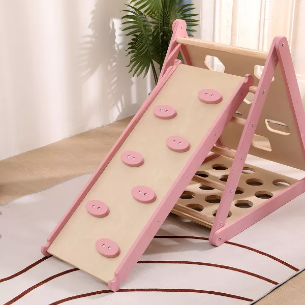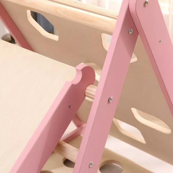 - Adorably Designed with Safety in Mind – With its slanted climbing area equipped with wooden pink grips for secure handholds and footholds, this climbing gym is not only safe but also irresistibly cute. Turn the climbing wall over and it becomes a smooth slide. All sides can be used for a variety of climbing scenarios. The entire frame is hand-painted in a soft pink hue, complemented by matching stepping stones, making it a delightful addition to any room’s decor.
