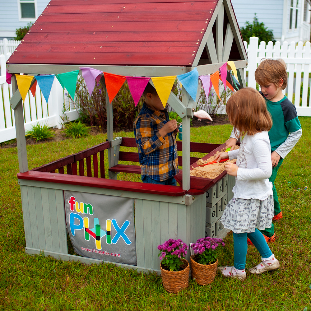Offering a host of exciting features, this backyard playhouse puts the fun into multifunctional! It’s a great way to get your kids off the couch and out in the fresh air. It gives youngsters an interesting and safe space to roleplay with their friends, while learning valuable socialization and teamwork skills. Your kids will have their own secret clubhouse, complete with a roof to provide shade, a bench where they can hang out, and doors they can scramble through. Creative kids will love to dig in the sandbox and challenge their friends to a game of supersized tic tac toe! The sturdy cedar wood parts ensure safe playtimes, while assembly is easy with no complex instructions. With its rustic design, the Hangout Hut will charm you and your kids. Order this Funphix playhouse to give your kids the gifts of social play and messy fun!